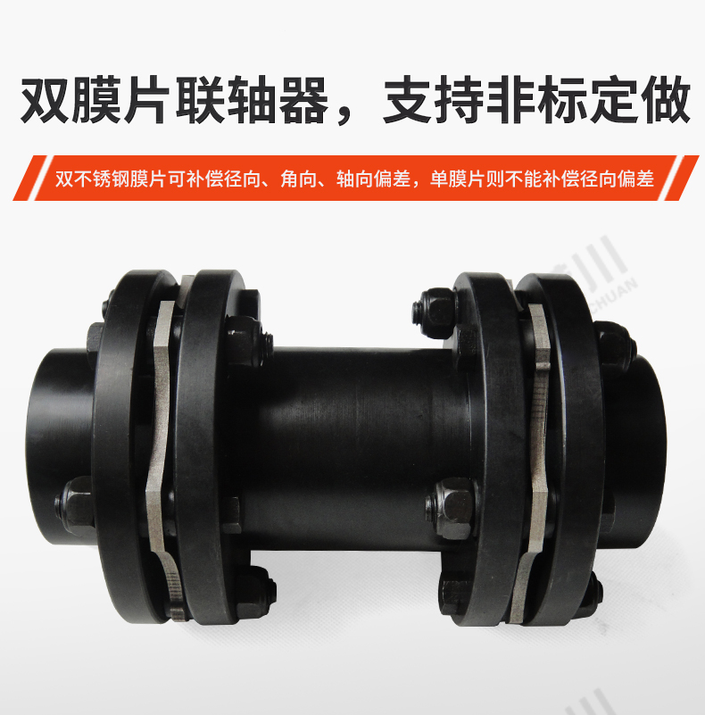 (6)双不锈钢膜片可补偿径向、角向、轴向偏差,单膜片则不能补偿径向偏差