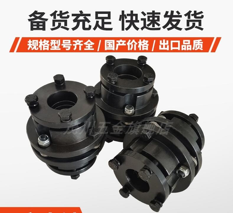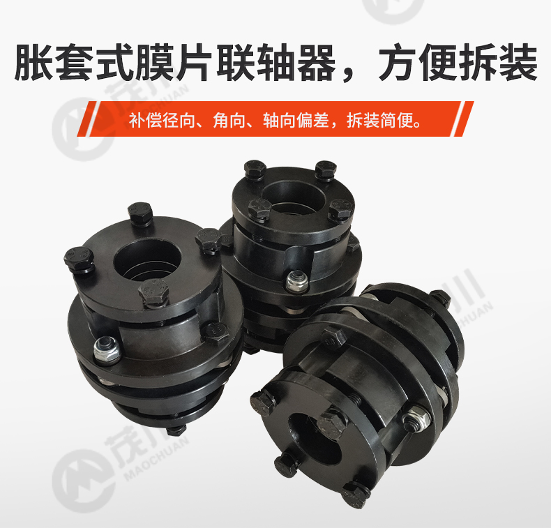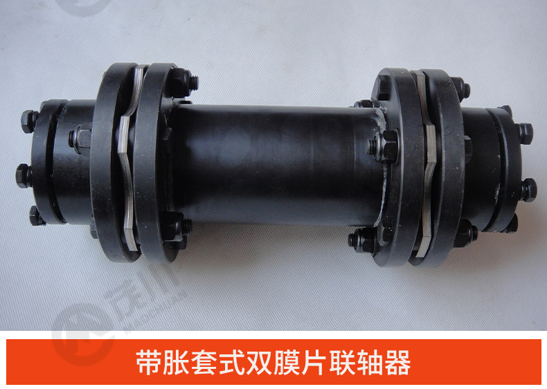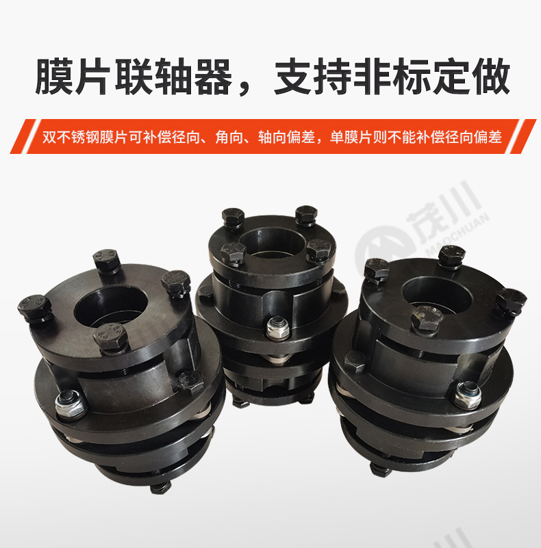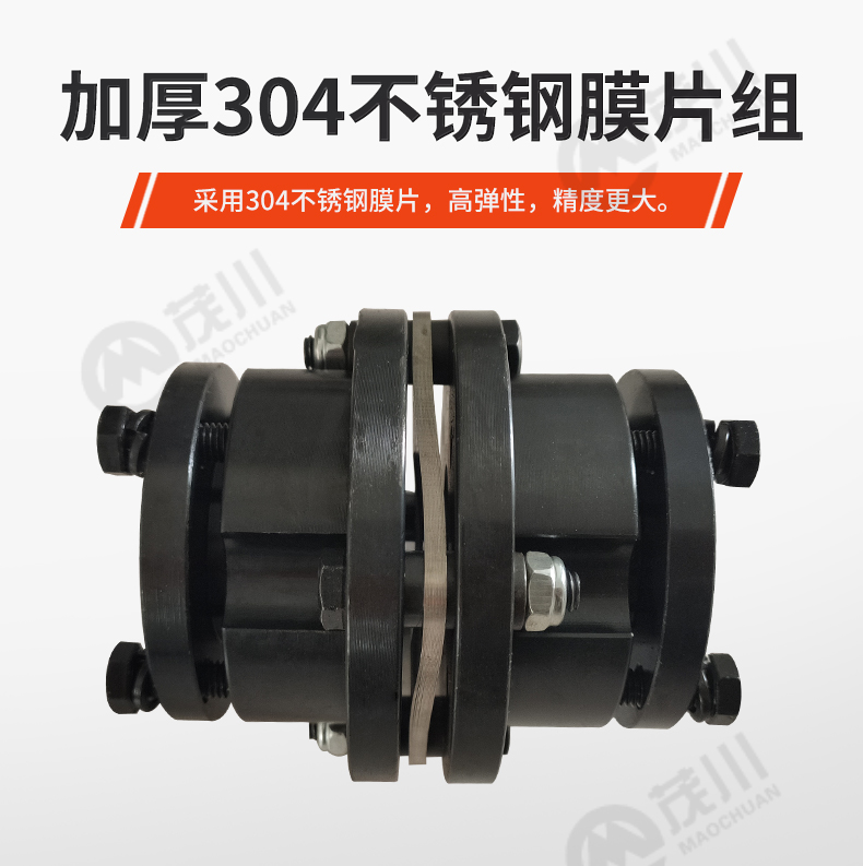 由几组膜片(不锈钢薄板)用螺栓交错地与两半联轴器联接,每组膜片由数片叠集而成,膜片分为连杆式和不同形状的整片式。膜片联轴器靠膜片的弹性变形来补偿所联两轴的相对位移,是一种高性能的金属强元件挠性联轴器,不用润油,结构较紧凑,强度高,使用寿命长,无旋转间隙,不受温度和油污影响,具有耐酸、耐碱防腐蚀的特点,适用于高温、高速、有腐蚀介质工况环境的轴系传动,广泛用于各种机械装置的轴系传动,如水泵(尤其是大功率、化工泵)、风机、压缩机、液压机械、石油机械、印刷机械、纺织机械、化工机械、矿山机械、冶金机械、航空(直升飞机)、舰艇高速动力传动系统、汽轮机、活塞式动力机械传动系统、履带式车辆,以及发电机组高速、大功率机械传动系统,经动平衡后应用于高速传动轴系已比较普遍。