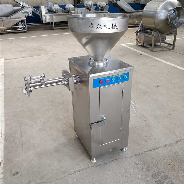 4、灌肠:灌肠机采用天然肠衣或者蛋白肠衣,天然肠衣用猪肠衣,直径22-24mm,蛋白肠衣直径在22mm为好,可根据灌装肠衣的长度来控制肠体的重量,灌肠机采用真空灌肠机较好。