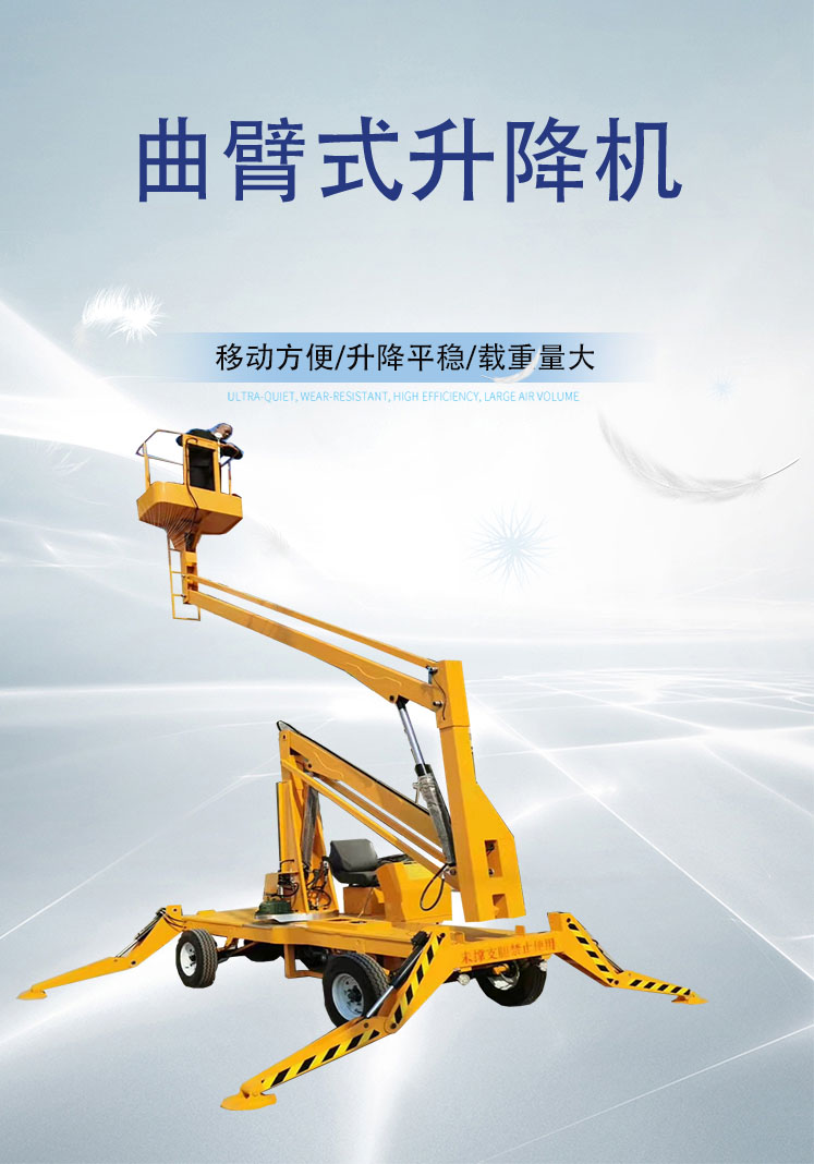 曲臂式升降机,是用于高空作业的升降设备,可跨越障碍进行高空作业,平台升降到任何位置时,均可边行走边作业,结构紧凑,转向灵活,其地盘的宽度可保证设备进入狭窄的通道及拥挤的工作区域。备用动力装置,可操作工作平台复位,方便的运输方式,可自行到任何地方。易于识别的操作面板,多重的机械,电气及液压安全保护,先进的一体化的液压电器集成系统,是目前为止垮障碍物作业性价比高的高空作业设备。