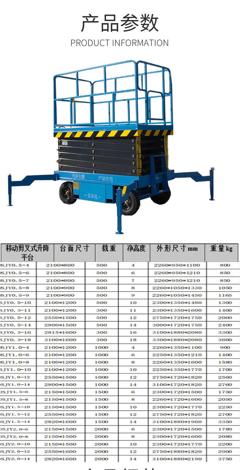 移动剪叉升降机主要是四轮移动行走,一般由底座、剪叉结构和工作台三部分组成。底座采用相应强度钢板焊接而成;剪叉结构采用山钢集团,上海宝钢集团的高强度锰钢矩管制作,强度高、外形美观;工作台,结构坚固,台面宽大,承载能力高,升降平稳,维护保养简单方便,可多人同时工作,使高空作业更安全、效率更高。并设有安全护栏,操作安全可靠。可根据客户要求进行尺寸的定做,台面延伸等。