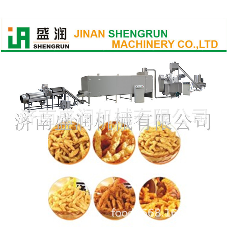 设备配置:拌粉机→螺旋输送机→旋转头挤压机→提升机→滚筒筛→连续油炸机→单滚筒调味线→包装机