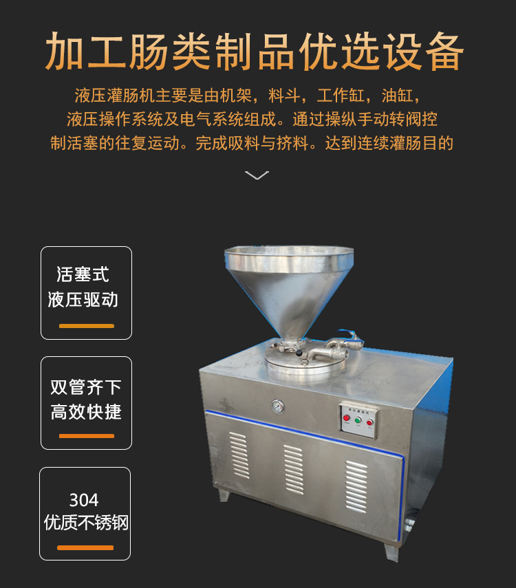 液压灌肠机是加工肠类制品的必备设备。能灌制大、中、小各种规格的肠制品。该产品外形美观、做工精良、操作方便、使用安全可靠。该机的料斗、阀门、灌肠管及整机外包装均采用优质不锈钢制造。符合食品卫生要求。