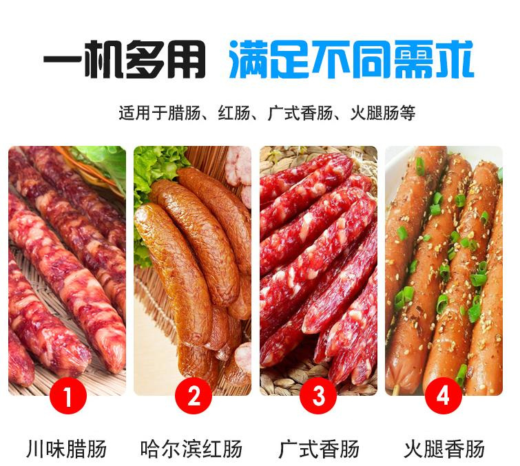 香肠灌肠机可生产广味香肠,川味腊肠、烤肠、亲亲肠、鸡肉肠、中式腊肠、大圆火腿、脆脆肠等肠类制品,适用于猪肠衣、羊肠衣、胶原蛋白肠衣、塑料肠衣的灌制。