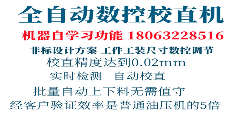 3米以上工件专用校直机,全自动数控伺服校直机,压头可根据工件弯曲点位置自由移动,通过伺服数控屏显系统实时显示校直精度数据,校直精度可达0.02mm,3-4秒可完成一个弯曲点的操作。经多方实际操作结果验证,效率为人工的3--5倍,成本核算结果可节省50%。工件的找点、校直、效率检测均由校直机独立完成,无需人工经验,不受人工牵制,老板更省心省力,效益提高更快!