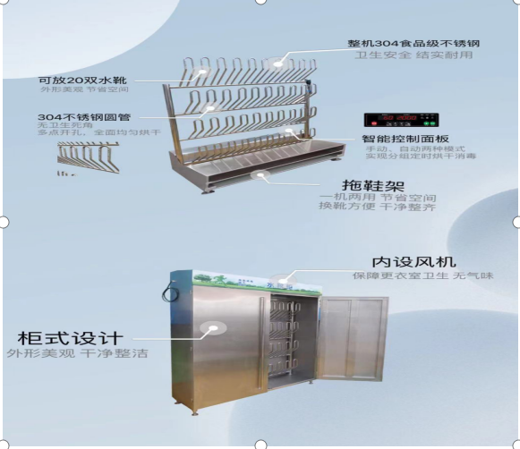 智能臭氧烘干水靴架采用304不锈钢材质制作,用于食品厂、电子厂等洁净车间更衣室存放和干燥工作水靴。