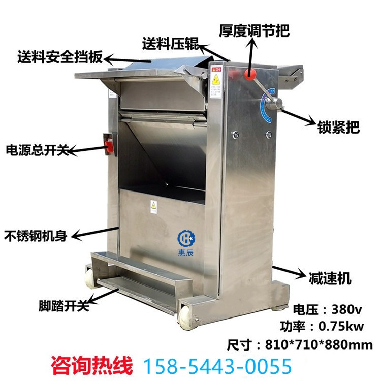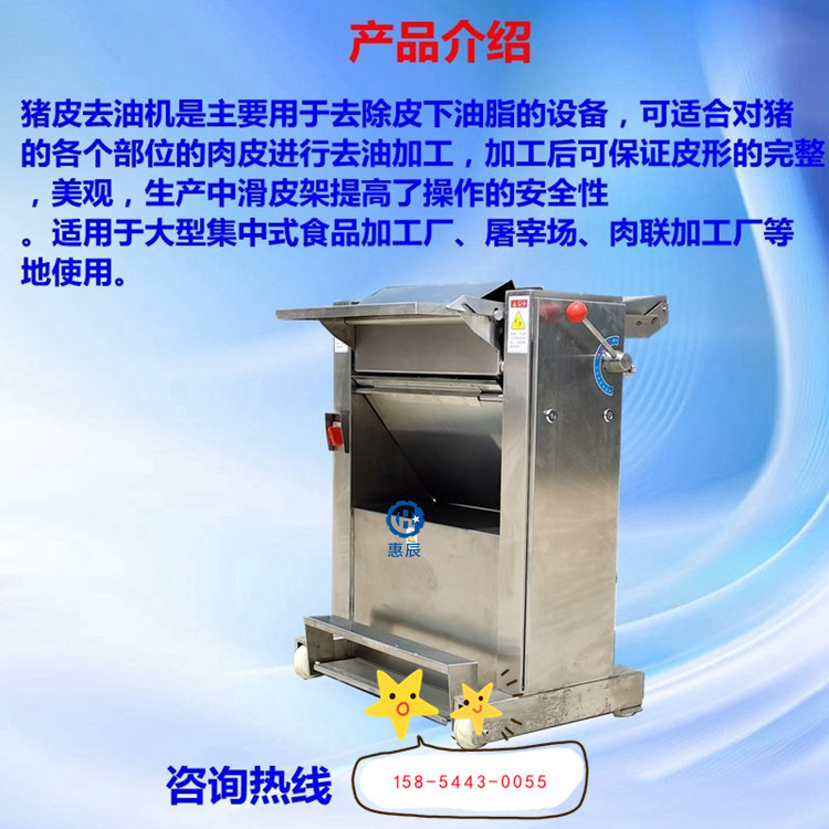 皮冻加工设备去油机 小型猪皮刮油机价格 实验用碎猪皮刮脂机 机身采用不锈钢制造而成,强度高, 猪肉去皮机主要用于多种分割后的肉类皮脂分离,机器配有自动剥落装置,可适合各种肉形的去皮,不损耗肉品,皮肉分离效果好,产品美观,可调式刀座,去皮厚度可随意调整,采用整机不锈钢结构,易于操作,效率高,使用后清理方便,脚踏板式操作简单,即踩即停。适用于大型集中式食品加工厂、屠宰场、肉联加工厂等地使用。