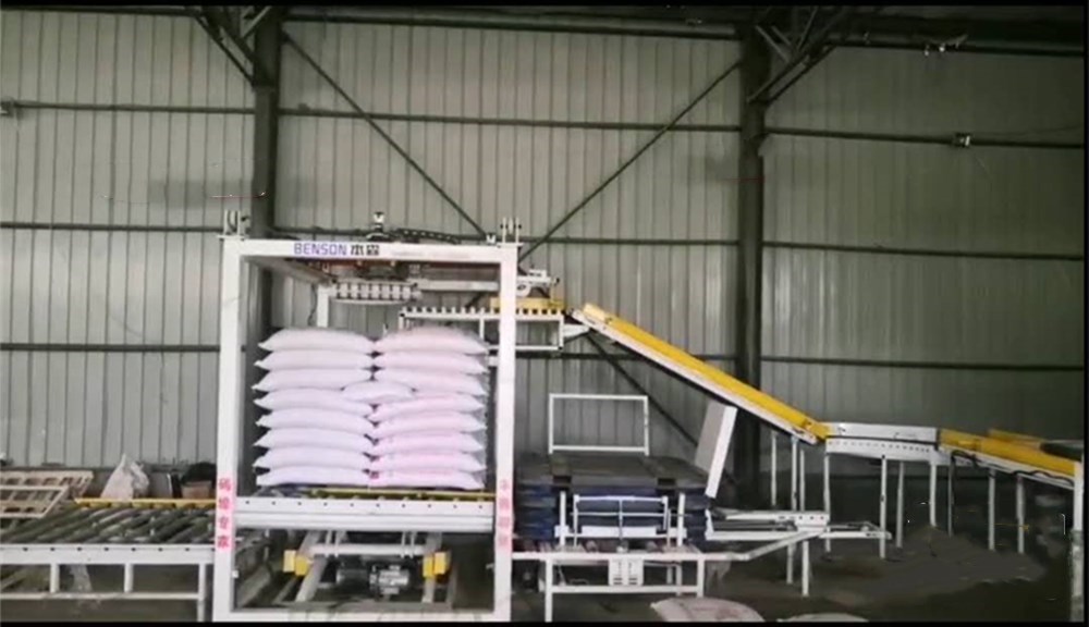 码垛机器人主要由机械主体、伺服驱动系统、手臂结构、末端执行器即抓手、末端执行器调节机构以及检测机构组成,按不同的物料包装、堆垛顺序、层数等要求进行参数设置,实现不同类型包装物料的码垛作业。按功能划分为进袋、转向、排袋、编组、抓袋码垛、托盘库、托盘输送以及相应的控制系统等机构。