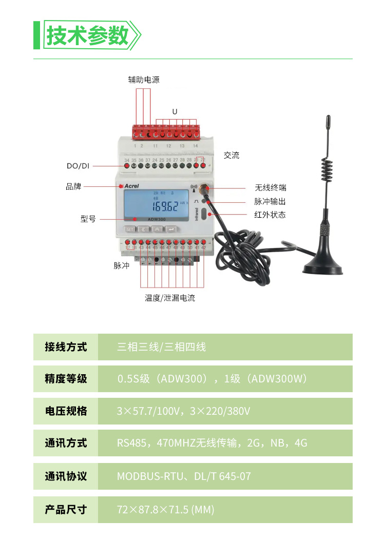 ADW300无线计量仪表主要用于计量低压网络的三相有功电能,具有RS485通讯和470MHz无线通讯功能,方便用户进行用电监测、集抄和管理。可灵活安装于配电箱内,实现对不同区域和不同负荷的分项电能计量,统计和分析。