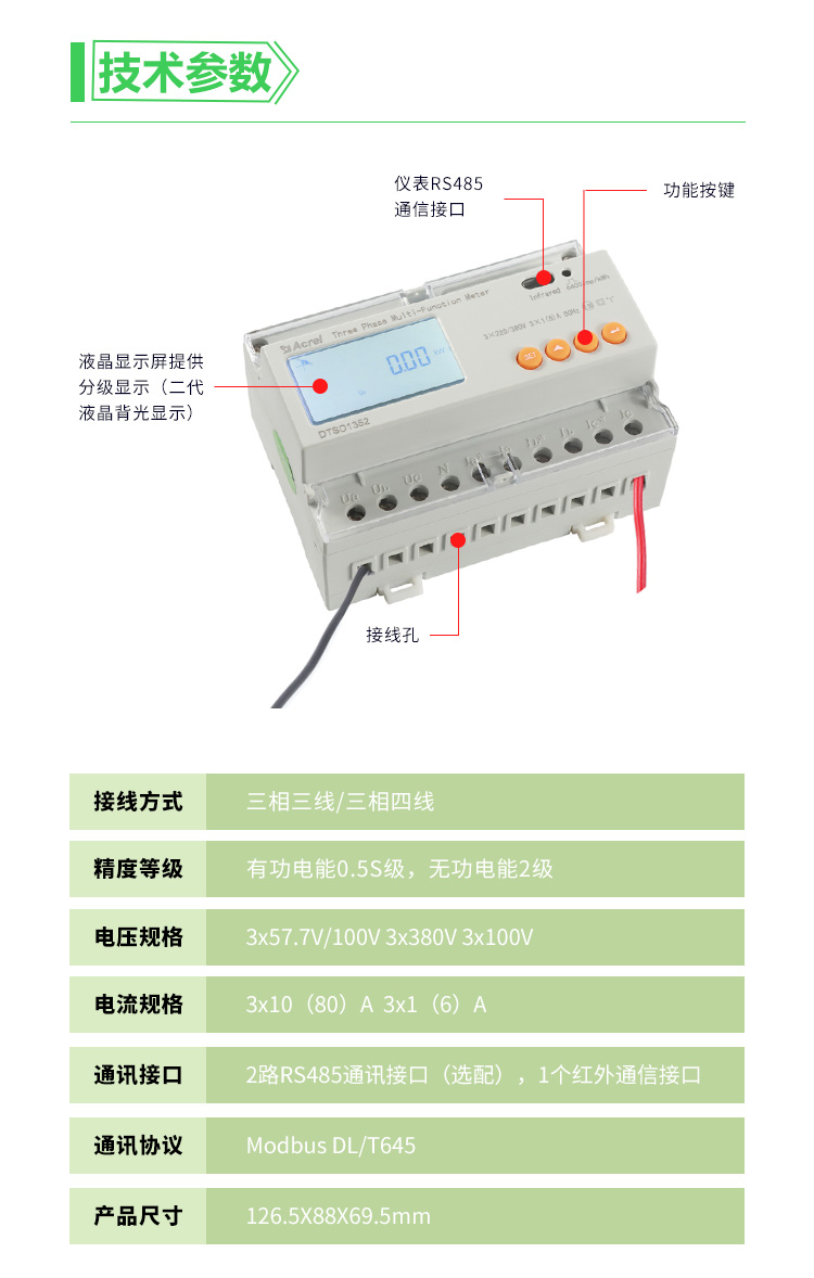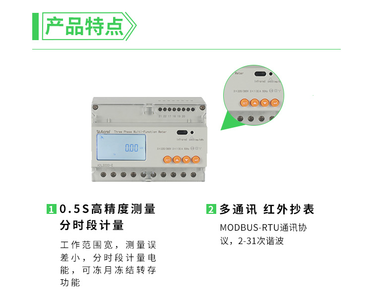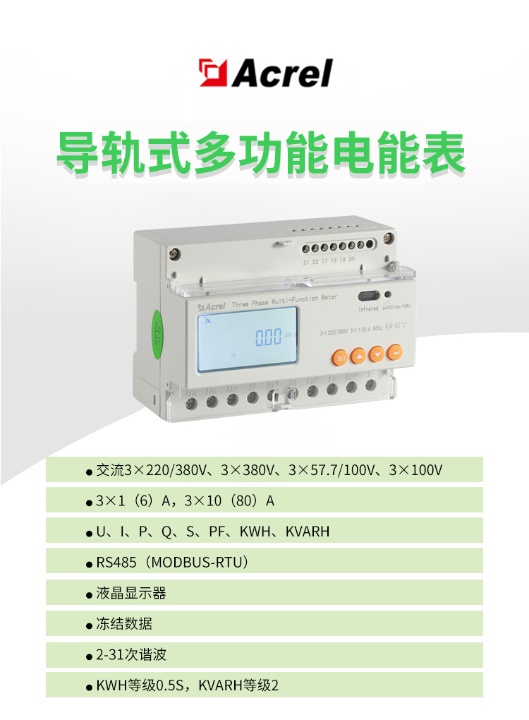 该系列产品采用DIN35mm导轨式安装结构,体积小巧,能测量电能及其他电参量,可进行时钟、费率时段等参数设置,精度高、可靠性好、性能指标符合国标GB/T17215-2002、GB/T17883-1999和电力行业标准DL/T614-2007对电能表的各项技术要求,并且具有电能脉冲输出功能;可用RS485通讯接口与上位机实现数据交换。