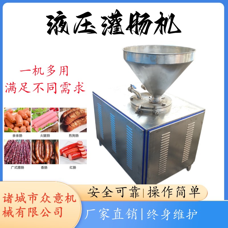 红肠加工设备灌肠机也可灌糜状的肠,灵活方便,加料自如,美观大方,结构紧凑,肠体均匀,即可灌肉块状的肠,操作方便,是肉类加工的理想设备出料速度快,维护保养便捷设可轻松灌制肉块香肠。关键部件特殊处理,并有很好的连续生产能力,清洗方便,控制部分均采用进口元件外观经过表面工艺处理,有安全防护装置,自动化程度高,省时省力。适合各种类型的生产企业.液压灌肠机比气动灌肠机动力十足。