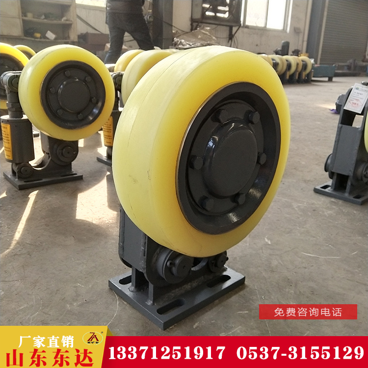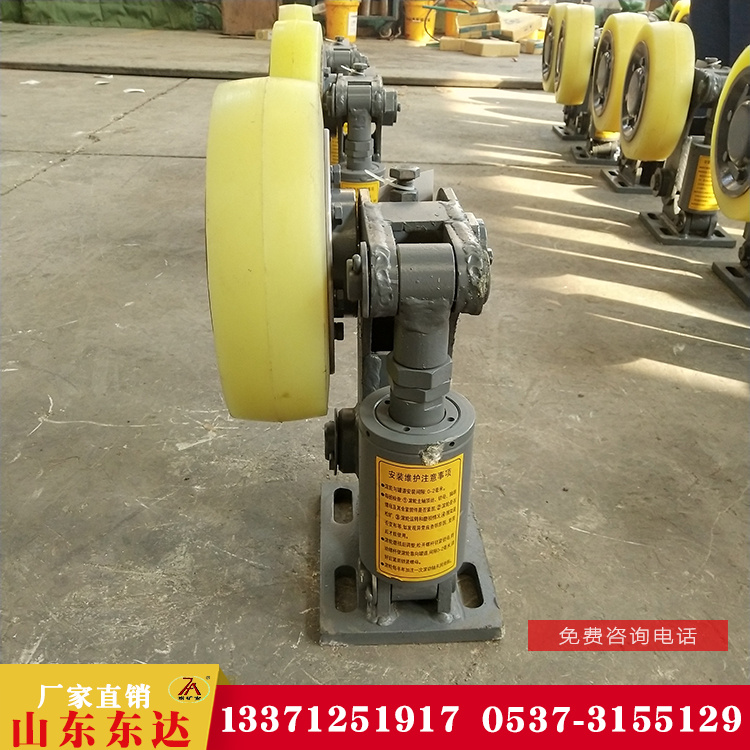 根据滚轮磨损情况,应对滚轮进行调整,方法是松开螺杆锁紧螺母,转动螺杆使滚轮靠向罐道,间隙0~2mm,调好后紧固锁紧螺母。