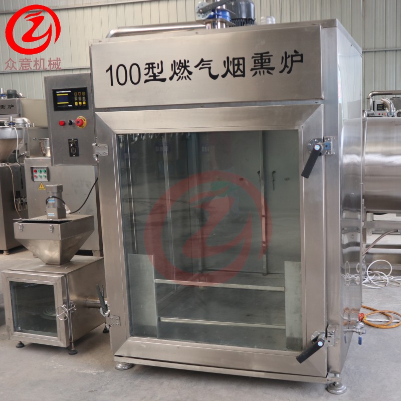 烧鸡烟熏炉是利用木材、木屑、甘蔗皮、红糖、白糖、药草等材料的燃烧而产生的熏烟,使肉制品吸收而增添加有的熏烟风味,提高产品质量的加工方法,其目的是改进产品风味,促进发色改善质地,提高抗氧化性和耐藏性。