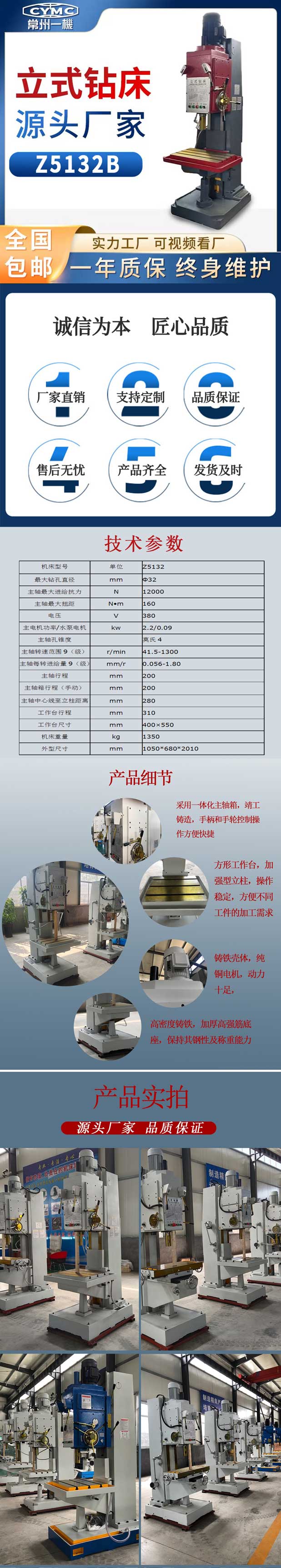 Z5132B立式钻床用于机械加工中的钻孔、扩孔、铰孔、锪平面、钻沉头孔和镗孔及攻螺纹,由主轴箱、立柱、底座、工作台等主要部分组成。床身采用加强钢板,能够保证机身具有足够强度、刚性和高稳定性。
