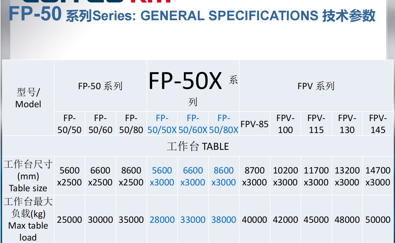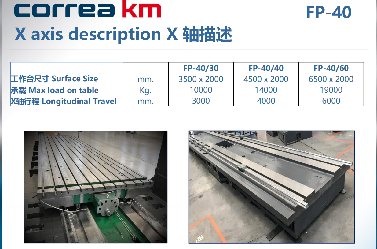 “correa km”牌 FP-50 系列是重型龙门式五面体或五轴联动  (当配置 C5E 铣头时)  加工中心。它的刚性设计和 技术方案使其可满足严格精度要求下的重型粗加工和精加工应用需求