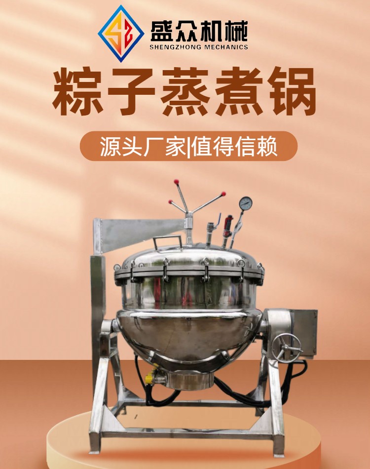 粽子蒸煮锅又叫粽子杀菌蒸煮锅,杀菌锅由锅体、锅盖、开启装置、锁紧楔块、安全联锁装置、轨道、灭菌筐、蒸汽喷管及若干管口等组成。锅盖密封采用充气式硅橡胶耐温密封圈,密封可靠,使用寿命长。