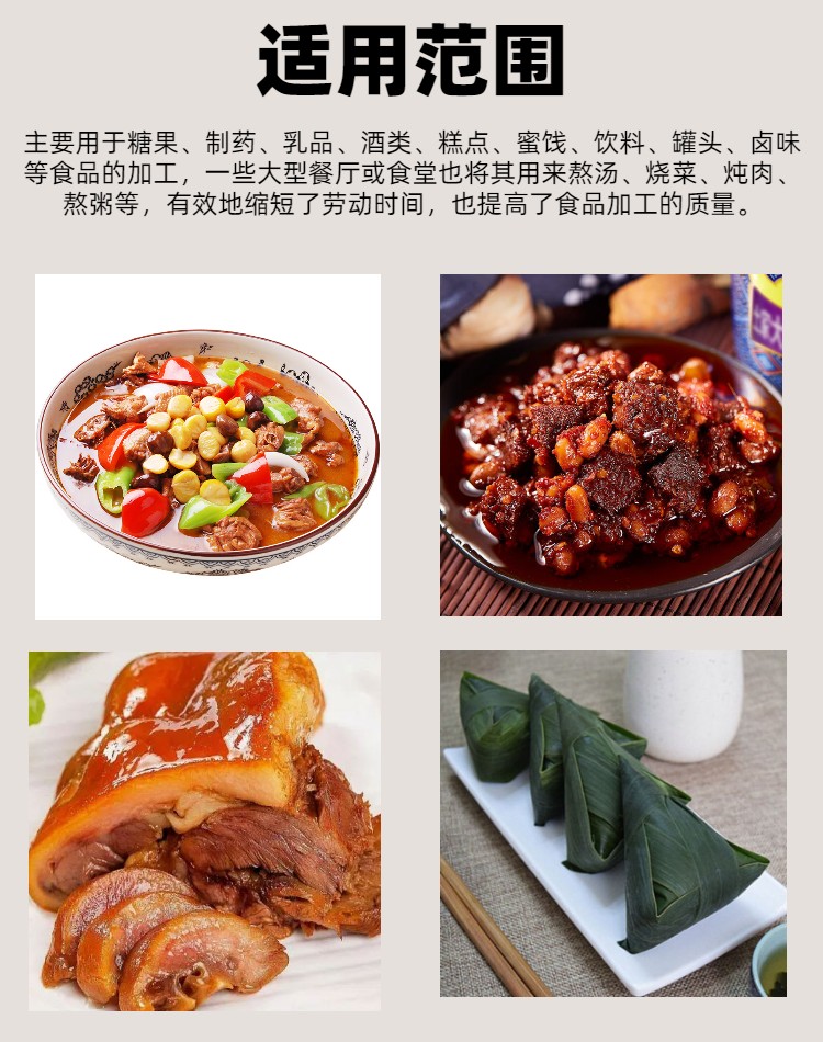 高压蒸煮锅广泛用于粽子蒸煮产业、肉制品熟食业、调味品加工业也用于糖果、制药、乳品、酒类、糕点、蜜饯、饮料、罐头、卤味等食品的加工,也可用于大型餐厅或食堂熬汤、烧菜、炖肉、熬粥等是食品加工提高质量、缩短时间、改善劳动条件的良好设备。