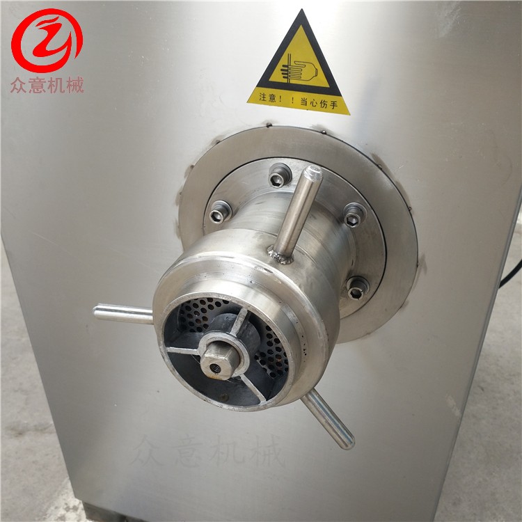 工作时利用转动的切刀刃和孔板上孔眼刃形成的剪切作用将原料肉切碎,并在螺杆挤压力的作用下,将原料不断排出机外。可根据物料性质和加工要求的不同,配置相应的刀具和孔板,即可加工出不同尺寸的颗粒,以满足下道工序的工艺要求。