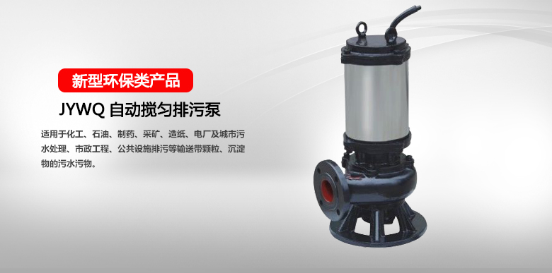JYWQ型自动搅匀潜水排污泵是本司在采用优良的水力模型开发研制而成的新型环保类产品,在排送固体颗粒和长纤维垃圾以及减少污水坑内沉积等方面,具有较好功能。其突出特点是在泵底盘处设计一个引水装置,该装置随电机高速旋转,将泵腔中的高压水引出,以10-20m/s的旋流速度冲洗水池的底部,利用搅拌池底堆积物,使其与水混为一体,随后在引水装置的周围进入泵腔并随之排出,防止污物杂物在池底的堆积,净化污水池。该泵水力性能已成熟,性能指标已达到同类产品高技术水平。
