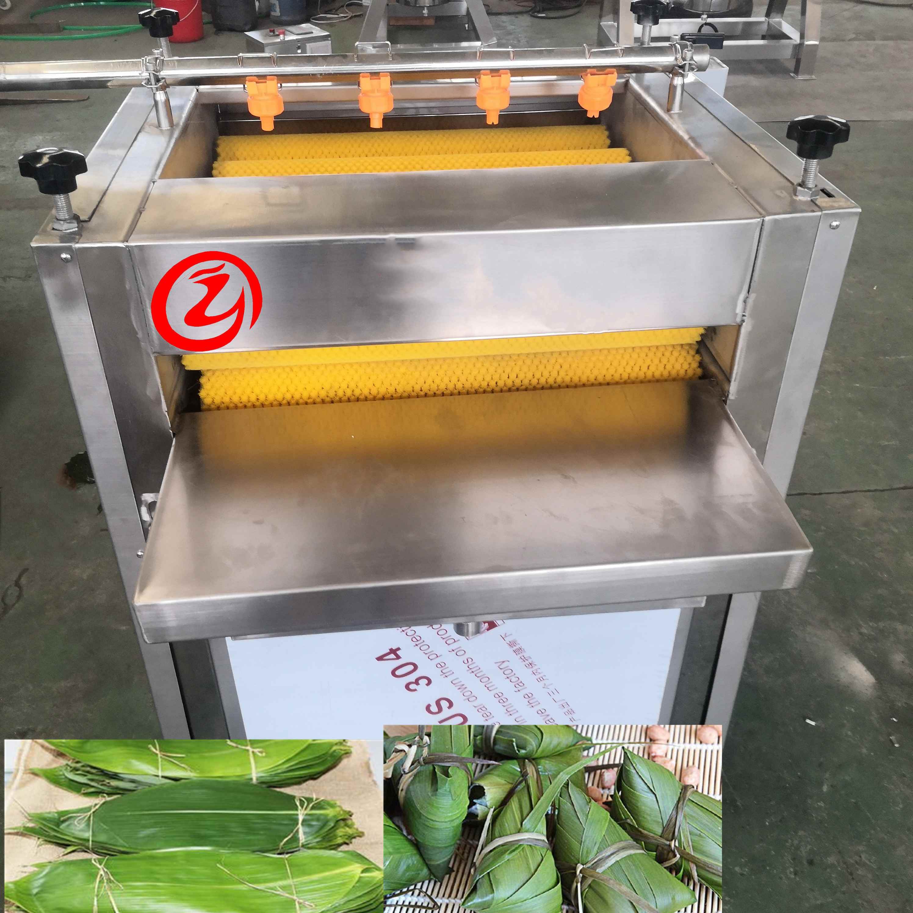 采用了SUS304不锈钢,通过粽叶铺平结构,毛刷以及喷淋清洗结构进行清洗。将侵泡好的粽叶通过人工放置到清洗台,网带自动将粽叶带入到毛刷和喷淋阶段,毛刷上组与下组存在速度差,从而形成一定的摩擦力,然后通过喷淋清洗干净,最后通过人工再收集起来。机身采用优质不锈钢折弯连接而成,有网带、滚筒、传动机构等。传送带采用高强度的不锈钢波浪串条网带,接条采用串条连成环状。适用于桂竹叶、月桃叶、芭蕉叶、荷叶、粽巴叶等粽叶的清洗。
