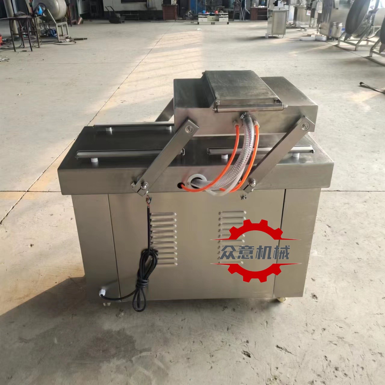 双室真空包装机有两个真空室轮流工作,真空室为不锈钢制作,结构合理,气密性好,美观,并符合食品卫生与防腐要求,上工作室装有一组热压封口装置,并采用平衡结构,可在任何位置停留,并有缓冲保护。经真空包装后的物品可防止氧化、霉变。