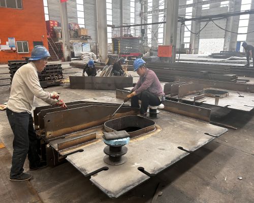 接下来是对内部横板腹板及纵肋构件的加工,以上构件矫正打磨后,便可以对钢箱梁桥进行拼装。因为钢箱梁桥采用倒置组装法,首先先铺设顶板,检验合格后再安装钢箱梁桥隔板,中间内隔板。