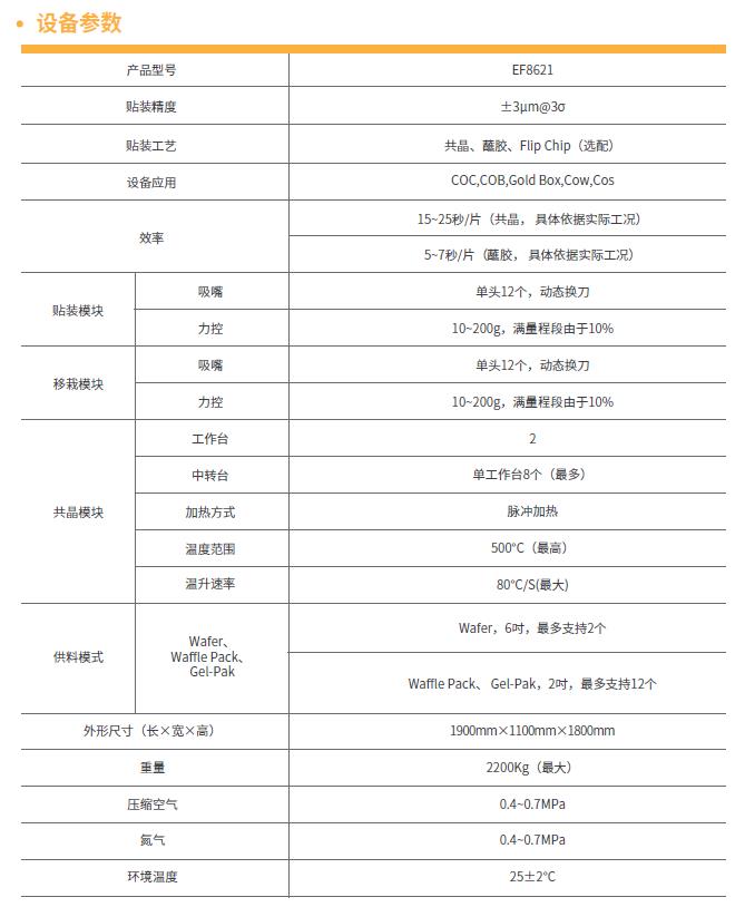 共晶机贴片机是微波模块、红外传感器、微电子机械系统(MEMS)、多芯片模块、堆叠式组装、混合器件和光电子封装等制造商的理想产品。能够为先进封装提供灵活而多样的封装能力,而且不会降低生产效率、质量和可靠性。EF8621贴片机能为先进封装提供灵活而多样的封装能力。