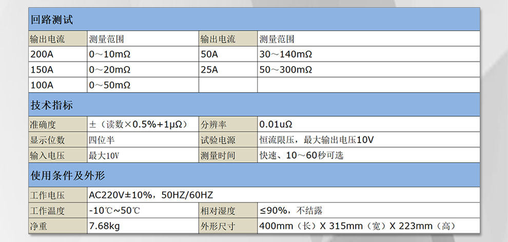 | 200A | 0~10mΩ | 50A | 30~140mΩ |