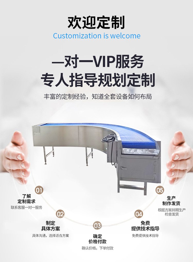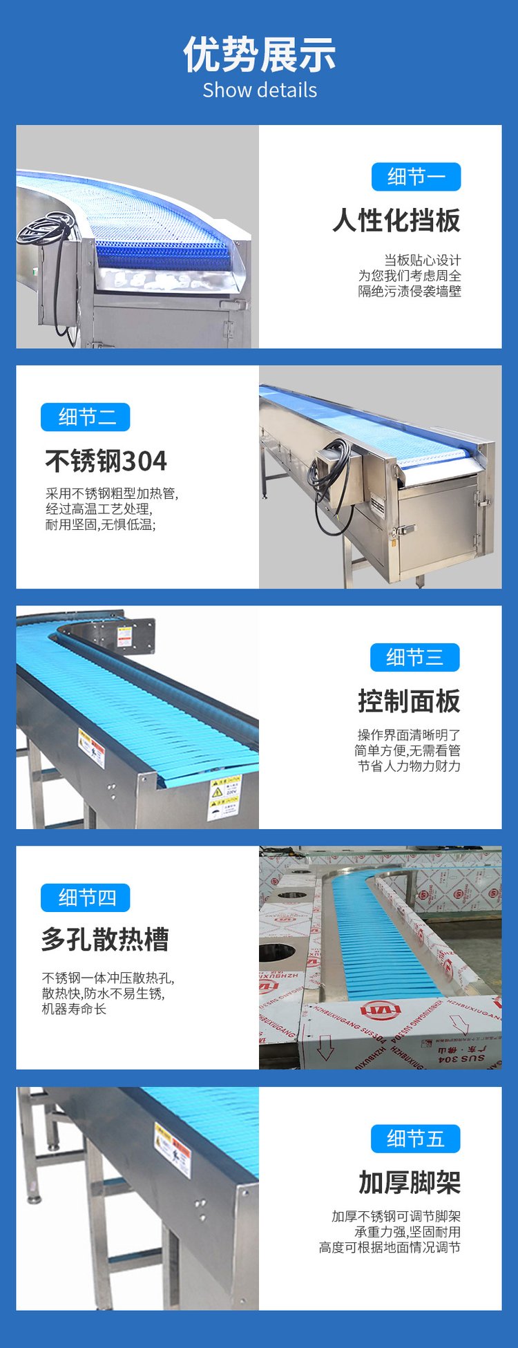 1 多工位流水线标准化作业 省力 2 速度可调 适用于各种配餐要求 3 食品级链板输送带 耐温 耐腐蚀 符合国家卫生要求 4 链板具有防偏定位功能 可直线可转弯 5 链轮带动网带 同步带驱动 传动力大 无噪音 传送稳定可靠 6 尾部松紧可调 轴承采用不锈钢轴承 7 机架 支脚 排渣机构 托辊 连杆等采用不锈钢 8 长度可根据客户需要定制