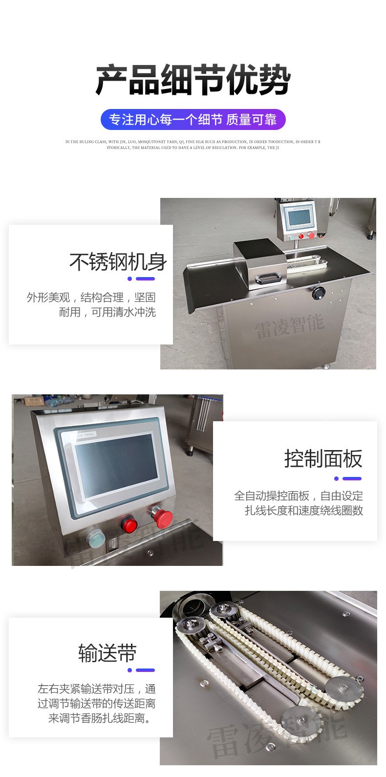 全自动单路香肠扎线机采用了先进的进口伺服电机和本公司较新研制的人机界面控制系统,具有效率高、易操控、节约生产原料等优点,产品的长度与直径可以根据客户的要求自主设定。适用于台湾热狗肠、台式烤肠、脆皮肠、早餐肠、鸡肉肠、欧式烤肠.扎线机,产品长度的调节可以随心所欲。该香肠扎线机机械的优点是节约肠衣。并且线扎的产品不用人工和机械剪节,相对扭结可节约人工3人以上和对剪节设备的投入,可结扎羊肠衣,猪肠衣,蛋白肠衣,塑料肠衣等,是香肠尤其是速冻台湾烤肠、亲亲肠生产定量、结扎的理想设备。 咨询:130--0278**8350