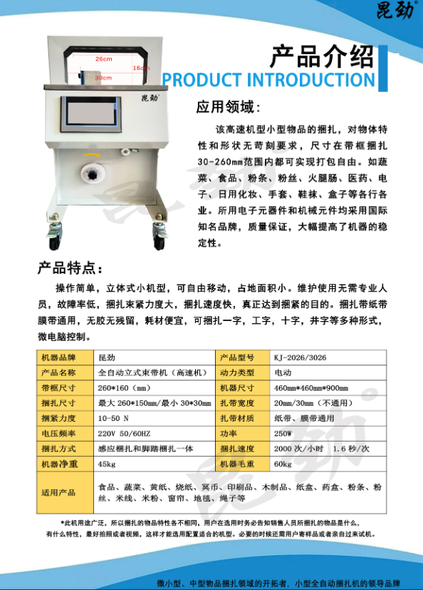 该高速机型小型物品的捆扎,对物体特性和形状无苛刻要求,尺寸在带框捆扎30-260mm范围内都可实现打包自由。如蔬菜、食品、粉条、粉丝、火腿肠、医药、电子、日用化妆、手套、鞋袜、盒子等各行各业。所用电子元器件和机械元件均采用国际知名品牌,质量保证,大幅提高了机器的稳定性。