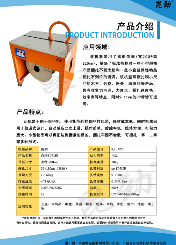 该机器采用了圆形带框(宽200*高220mm),解决了标准带框对一些小型规格产品捆扎不紧太松和一些小直径弹性物品捆扎不到位的情况,该机型可捆扎稍小尺寸的木方、竹签、粉条、纺织品等产品,具有收紧力可调,力度大,捆扎速度快,效率高等特点,同时9-1)mm的PP带皆可适用。