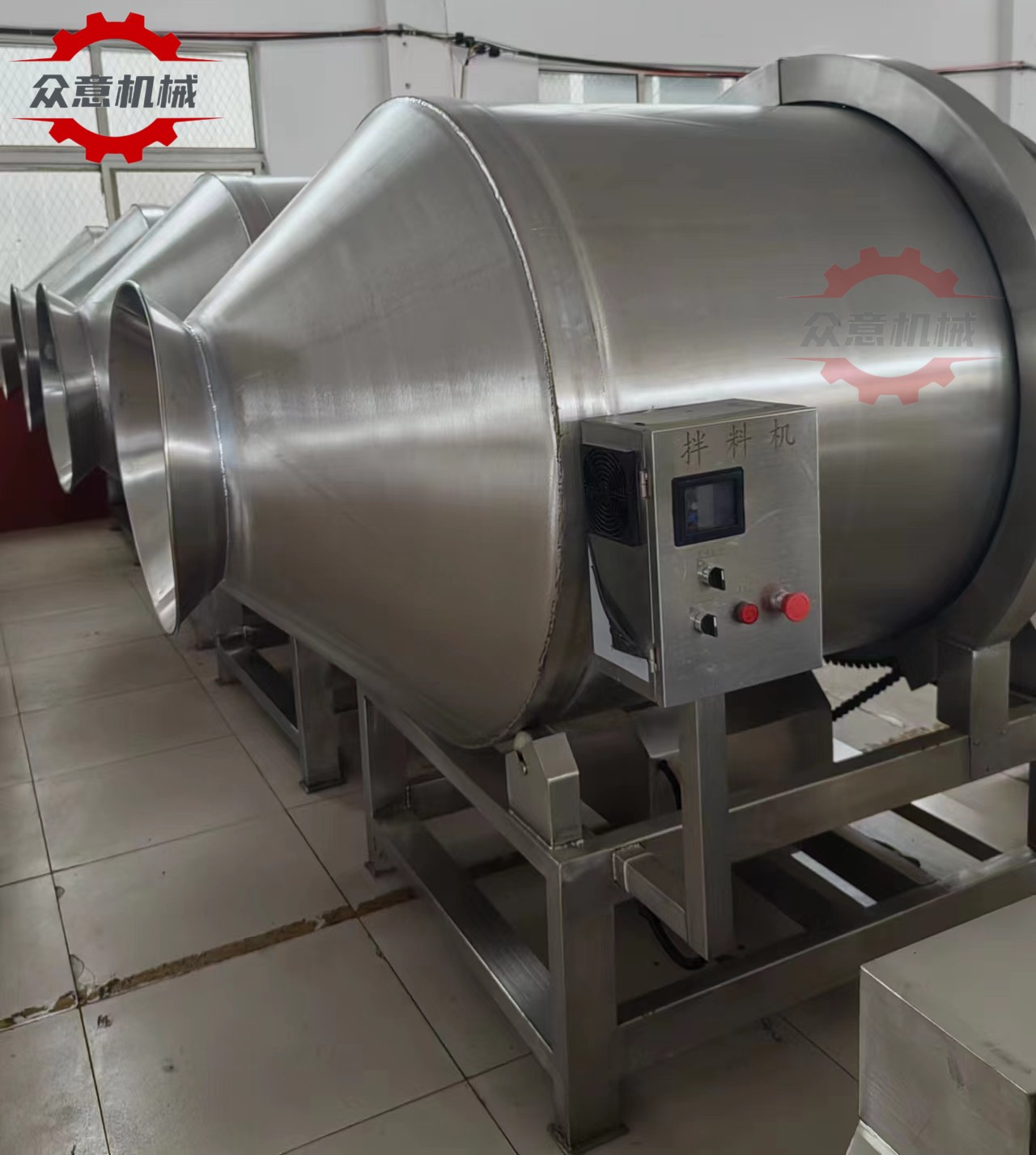 真空滚揉机是通过内部带有倾斜浆叶的滚筒带动桶内原料运动,从而对原料进行拍打,使原料入味。真空滚揉机利用真空泵,将滚筒内抽成真空状态,这样肉制品细胞会由于压强差异,在细胞膜内外产生渗透压,细胞就会如同呼吸一样,自动吸取腌渍液。真空腌制机可以减少产品的腌制时间,缩短了产品的生产周期。