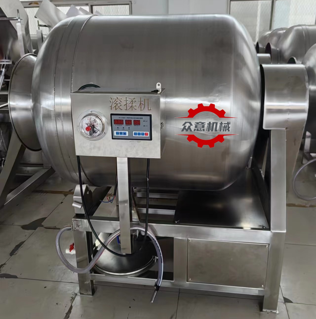 真空滚揉机的用途主要是将加工的肉类,如牛肉,羊肉,鸡肉,鸭肉,鹅肉,猪肉,鱼肉等放在真空状态内,可提高调味品进入肉品的速度,并大限度的保持肉内的水分。使肉及添加剂溶为一体,以达到肉质鲜嫩,出品率高的目的。是生产香肠、适用于西式香肠、火腿、培根、烤肉以及禽类、中式酱卤类、休闲类肉食品的腌制加工。