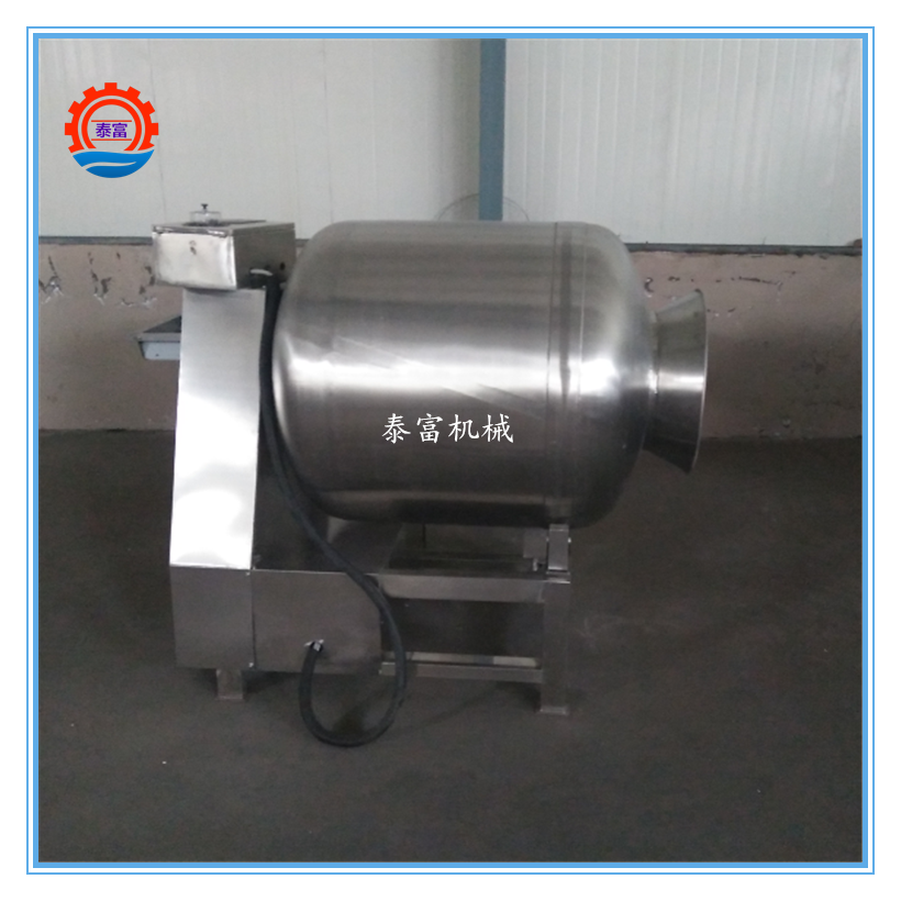 真空滚揉机工作原理是把调味的辅料和猪肉、羊肉、鸡肉等物料一起放入真空滚揉机中立即进行抽真空,同时通过机器满速运转,利用物理冲击原理,肉块在滚筒内上下翻动,部分肉被其中的挡板带到高处,然后自由落下,与低处的肉块互相撞击。由于旋转是连续的,所以每块肉都有自身翻转、肉间互相揉擦和互相撞击的机会。这样,可使原来僵硬的肉块软化、肌肉组织松弛、腌渍液容易渗透和扩散、肉发色均匀、同时起到拌和作用。由于不断的滚揉和相互挤压,腌渍液被肉充分地吸收,增强肉的结合力及弹性,具有肺呼吸功能,从而提高产品的口感及断面效果;可以增强保水性,提高出品率;可以改善产品的内部结构。