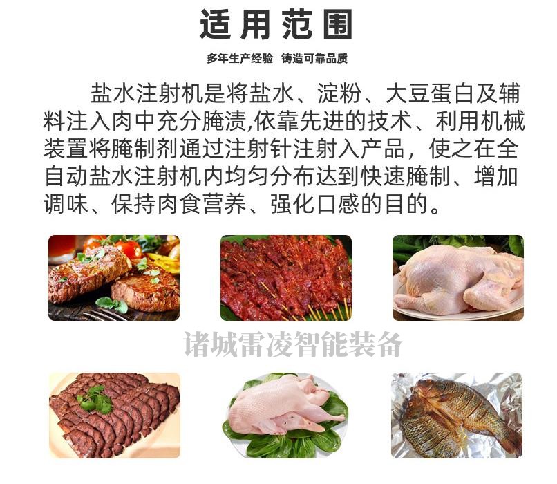 广泛应用于肉食加工的食品企业,是制作火腿、烤肉、酱肉、鸡类、鸭类、鹅类、牛肉等肉类制品的必选设备。盐水注射机是将盐水、淀粉、大豆蛋白及辅料注入肉中充分腌渍,依靠先进的技术、利用机械装置将腌制剂通过注射针注射入产品,使之在全自动盐水注射机内均匀分布达到快速腌制、增加调味、保持肉食营养、强化口感的目的,欢迎广大客户来公司试机考察。