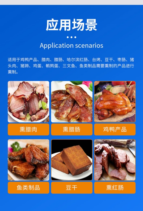 烟熏炉可定制为蒸气,电两用加热方式。适用于用于香肠,火腿,烤肠,培根,腊肉,烤鸡,重鱼,烤鸭以及家离,水产品等重制产品,烘烤烘干,上色一次成型烟重色泽好,口感更佳质量保证,技术优良操作方便。经过烟熏后食品的颜色好看,还有一种烟重后的香味,让人感觉香而不腻,也能达到环保效果,代替了传统的烟熏方法。