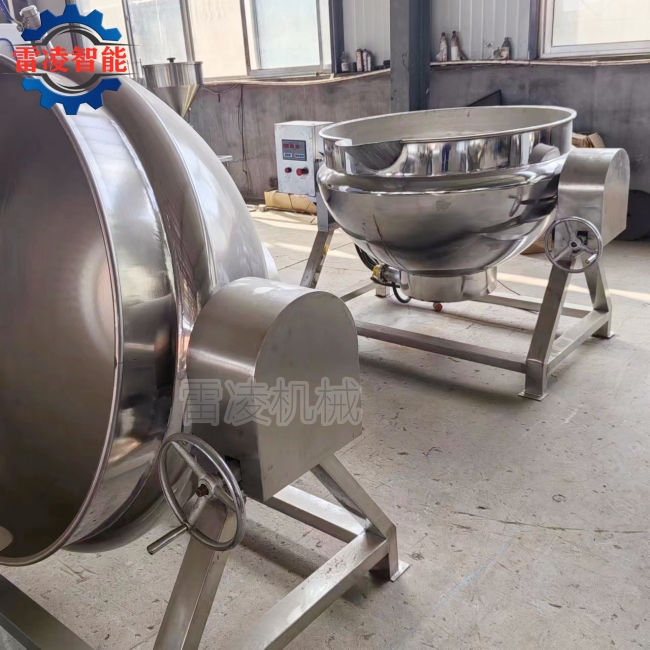 1、本产品为可倾式下搅拌炒锅,解决了上搅拌的:出料难,不易清洗的问题。