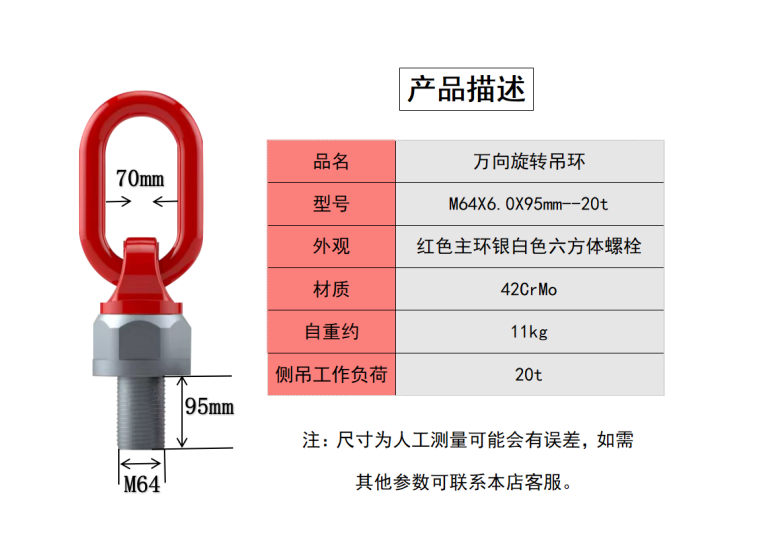 旋转吊环主要由旋转体、起重吊环、钢珠等组成,旋转吊环螺栓螺纹部分为标准件公制螺牙。旋转吊环主要应用在海上、电力、造船、工业、建筑、航空、游乐设施、机械吊装等领域下。旋转吊环在机械吊装场景下使用可以任意方向起吊。具有4倍安全系数。但在使用旋转吊环时需根据实际情况选用相应规格、螺纹大小的吊环,不可超载使用,以确保施工质量和安全。旋转吊环的安装吊装方式也要按照产品说明进行,以免发生不必要的麻烦。