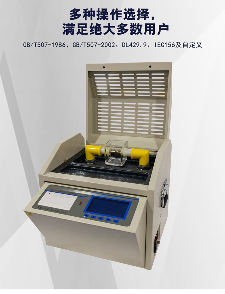 3. 多种操作选择,仪器程序设有GB507-1986、GB507-2002两种国家标准方法、行业标准DL/429、国际标准IEC156及自定义操作,能适应不同用户的多种选择;