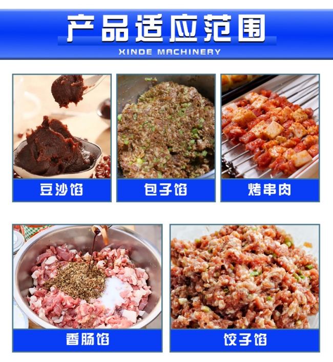 本机采用的搅拌器,使拌出的肉馅纤维细化,并使肉纤维间的动物蛋白能游离析出,以保证肉馅拌和均匀并使之程蓬松状态,加入的调味汁液能充分吸收饱和,以保持馅的松、鲜、嫩、口感味道的特点。机器接触食品的部位均不锈钢制造。