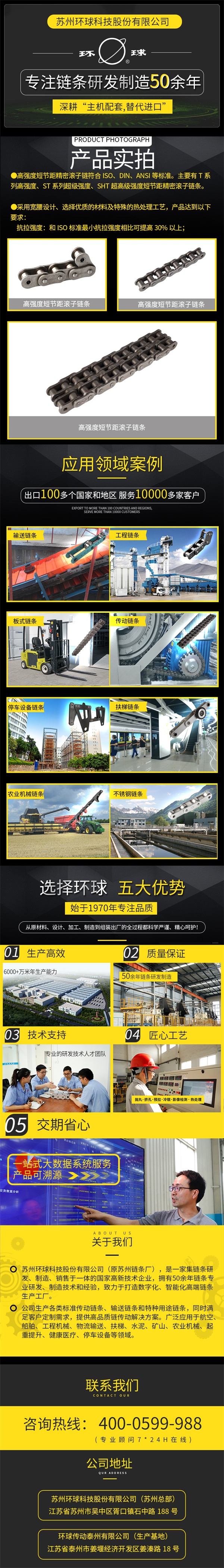 环球传动(原苏州链条厂)始建于1970年,总部位于江苏苏州,生产基地位于江苏泰州,是一家集链条、轴承和智能系统研发、制造、销售于一体的高新技术企业,有着50多年专业链条研发、制造技术和经验,致力于打造数字化、智能化高端链条生产工厂。公司生产各类标准传动链条、输送链条和特种用途链条,同时满足客户定制需求,提供链传动解决方案。广泛应用于工程机械、物流输送、扶梯、水泥、矿山、农业机械、起重提升、停车设备、食品加工、包装机械、环保装备等领域。