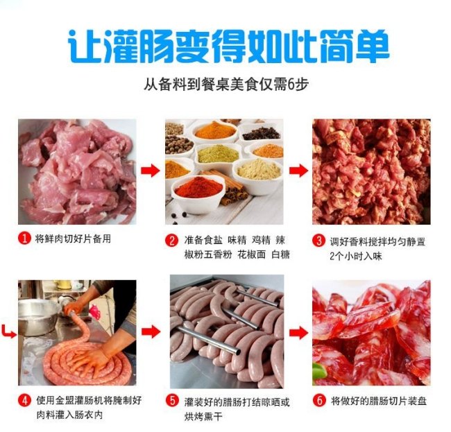灌肠机(食品加工机械厂家Tel:186*1508-5507)采用先进技术研制运用气动,光电控制原理,可连续自动定量灌肠制和中种食肠,操作简单,维修方便,准确性高,重复性好,是一种高效率,易操作的理想产品?整机采用优质不锈钢制成,外型美观,结构紧凑合理,密闭防水,易于清洗。