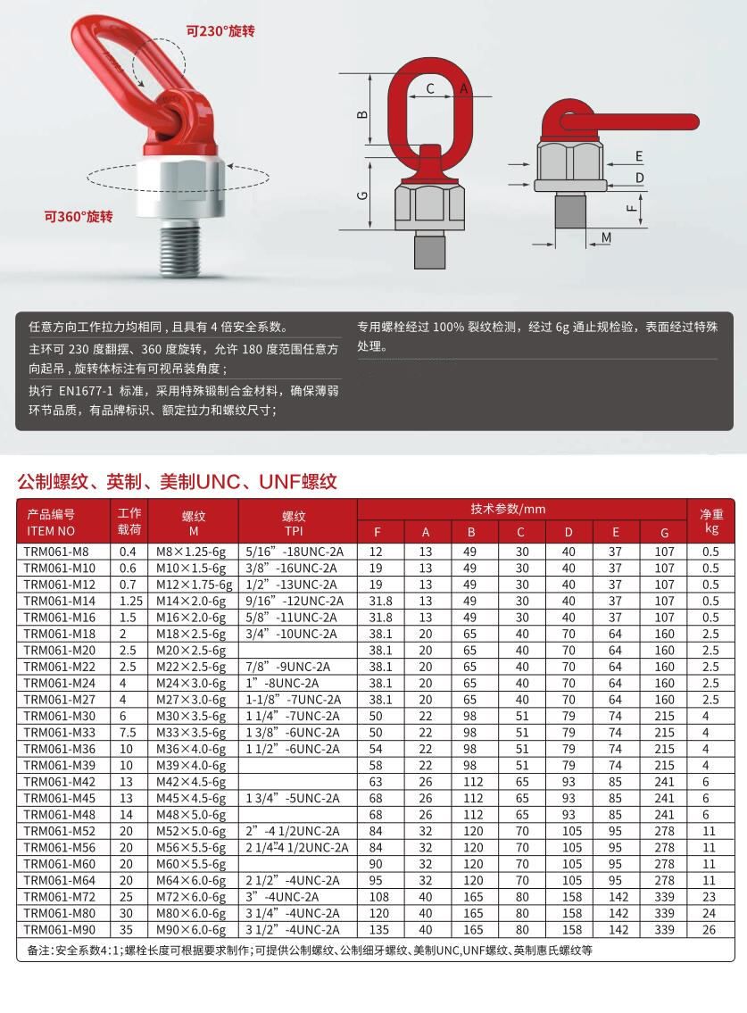 特尔姆万向旋转吊环符合EN1677-1标准,具有CE认证。螺栓体可以360度旋转,主环可以230度翻摆、允许180度范围内任意方向起吊。螺栓经过100%裂纹检测,经过6g通知会检测,表面经过特殊处理。产品合格才会进行发货,不需担心质量问题。
