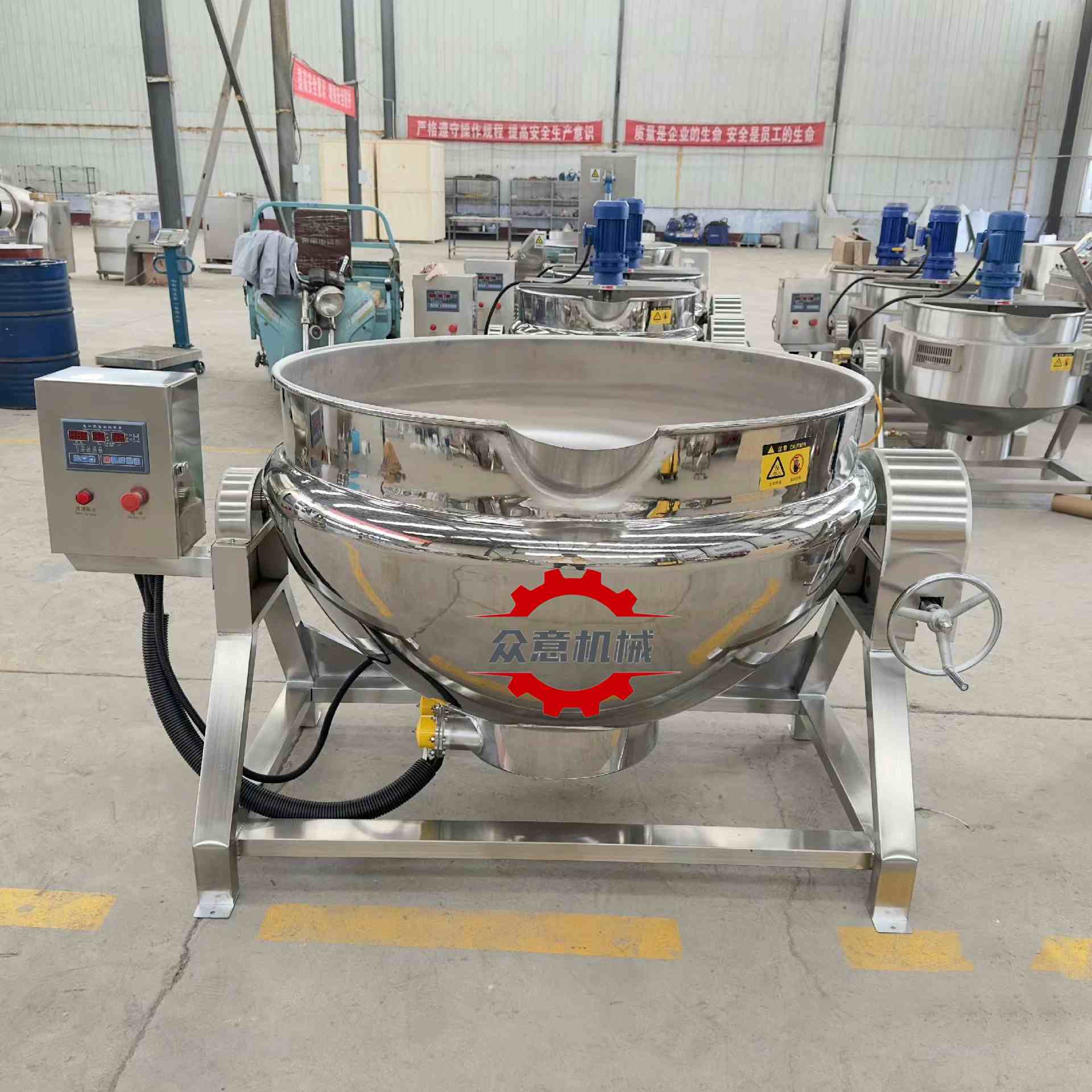 夹层锅自动翻转出料:锅体采用加厚304不锈钢板冲压成型,确保设备坚固耐用,使用维护成本低。该设备外观豪华,采用全不锈钢结构,整体封闭无死角,使用安全更节能,热效率可达85%以上。锅体方便可倾,出料清洗十分方便。大小热功率可调,加热保温方便。可用于鸡爪,猪蹄,鸭脖,炖肉等卤制或制作。(食品加工机械厂家Tel:155*5361-8501)