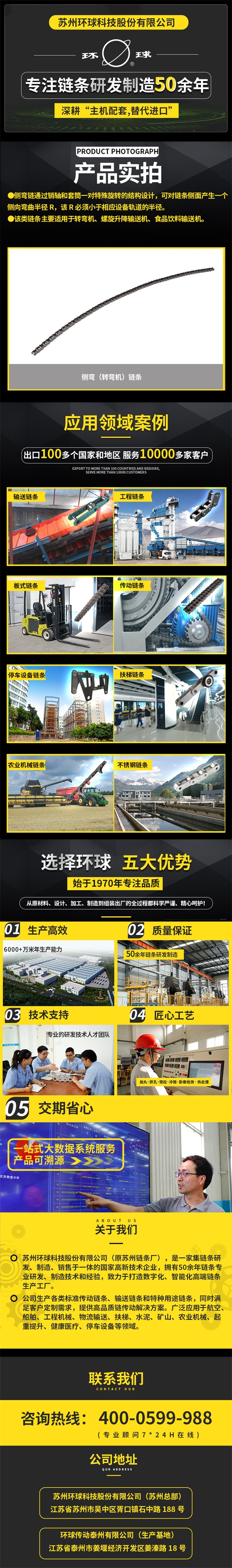 环球传动(原苏州农机配件厂)始建于1970年,是一家集链条、轴承和智能系统研发、制造、销售于一体的国家高新技术企业,拥有国家认定企业技术中心,是中国链传动行业重点骨干企业和专精特示范企业。拥有50年链条专业研发、制造技术和生产经验,致力于打造数字化、智能化的高端链条生产基地。