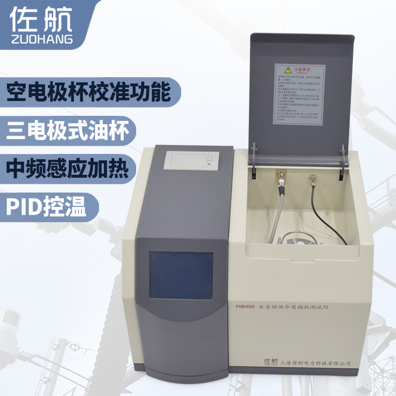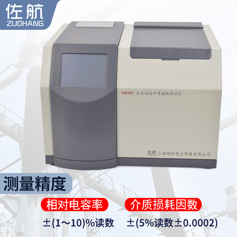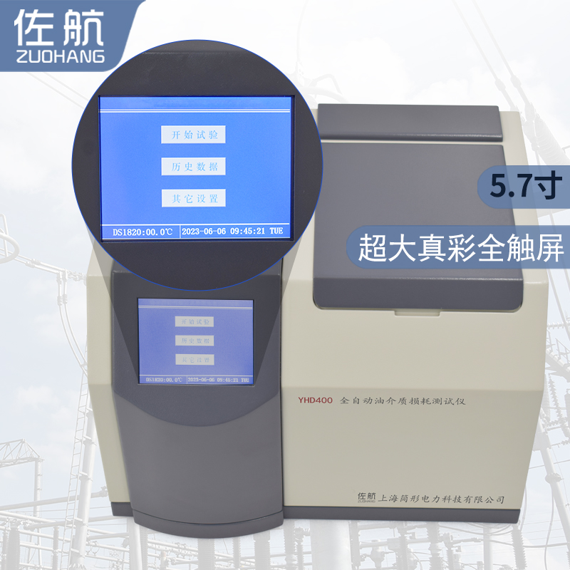 佐航YHD400全自动绝缘油介质损耗测试仪依据GB/T5654-2007《液体绝缘材料 相对电容率、介质损耗因数和直流电阻率的测量》设计制造。用于绝缘油等液体绝缘介质的介质损耗因数的测量。一体化结构。内部集成了介损油杯、温控仪、温度传感器、介损测试电桥、交流试验电源、标准电容器、高阻计、直流高压源等主要部件。仪器内部采用全数字技术,全部智能自动化测量,配备了大屏幕5.7寸TFT纯彩液晶触控显示器,全中文菜单,测试结果可以自动存储并打印输出,操作人员不需专业培训就能熟练使用。