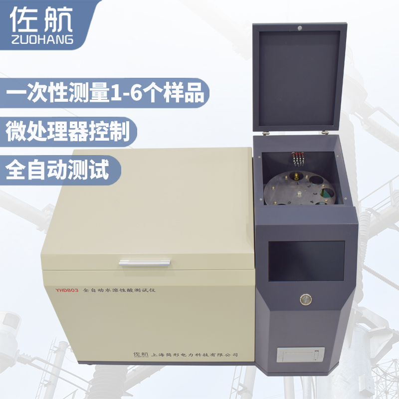 佐航YHD803全自动水溶性酸测试仪(比色法)是根据中华人民共和国国家标准GB/T7598-2008运行中变压器油水溶性酸测试法及相关标准设计制造。采用大屏幕液晶显示,利用微处理器控制,可以根据用户的设定条件自动完成加热、恒温、振荡、取样、测试、清洗、打印等功能,可以一次性测量1-6个样品,大大缩短了用户的测试时间。