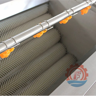 1. 设备采用尼龙刷丝,耐磨不掉毛等精细材料,毛辊在电机的带动下通过相对逆向滚动,与产品直接接触产生摩擦达到去皮效果;并设有特制的自动高压喷淋喷头进行边去皮边冲洗,即可达到产品清洗并去皮的效果;
