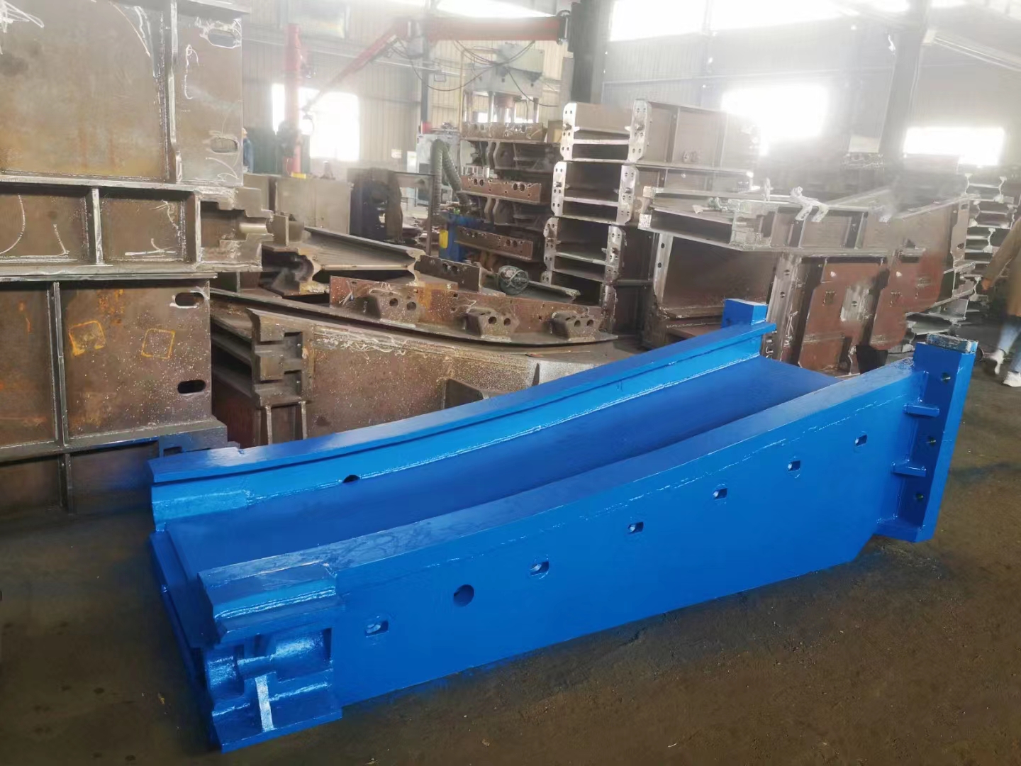 8.中部槽:中部槽是刮板输送机的重要组成部分,由两块对称放置的槽帮和中板焊接而成,在槽帮一端焊有联接销,另一端焊有联接耳,两槽帮外侧凹部各焊4个支座。槽帮两端经中频淬火后,提高了槽帮的耐磨性。中部槽间相连时,经一节槽的槽帮上联接销插入另一节槽帮外凹部内,用螺栓穿过联接耳将各节槽联接在一起,使其能在垂直和水平面内相互偏转3度。